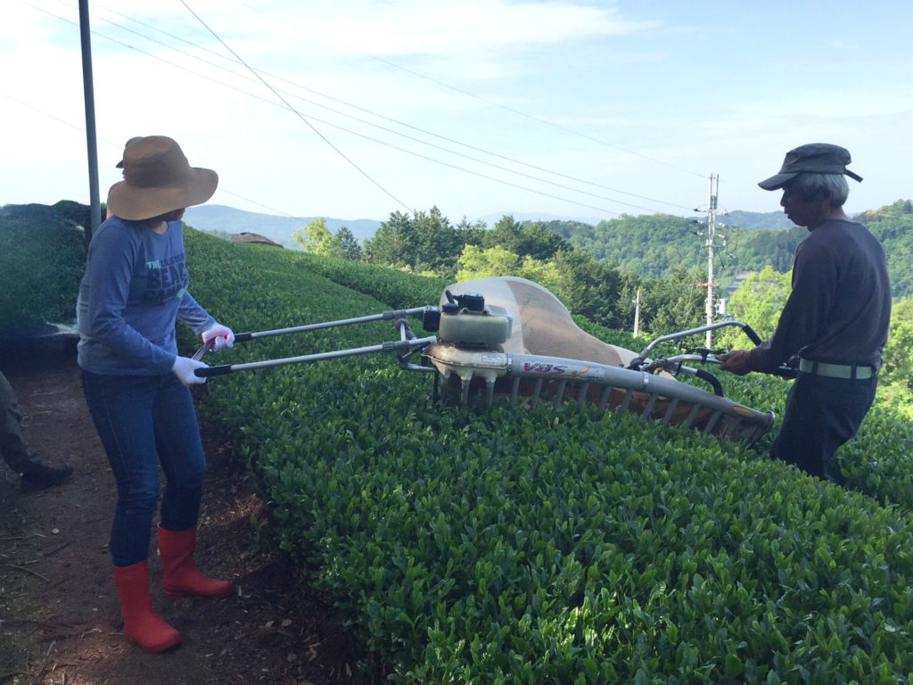 機械で生葉を刈り取る時は樹勢を均一に保ってやるため、水平に刈り取ります。二葉を残しながら刈り取ります。